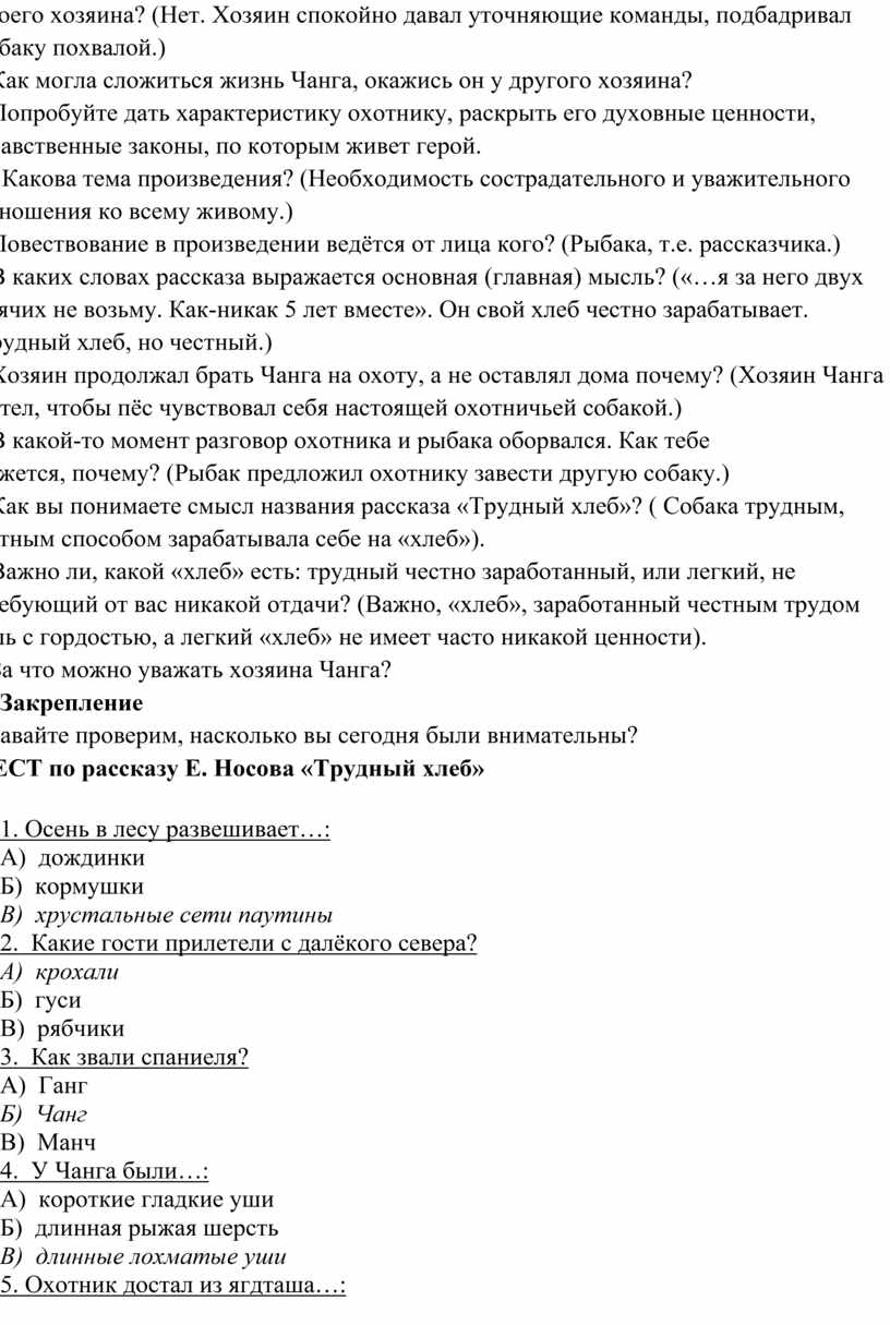 ТЕСТ по рассказу Е. Носова «Трудный хлеб»
