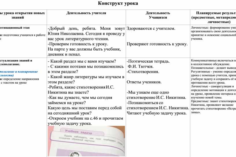 - Какой раздел мы с вами изучаем? - С какими поэтами мы познакомились в этом разделе? - Какой жанр литературы мы изучаем в этом разделе? -Ребята, какие стихотворения И.С. Никитина вы знаете? -Как вы думаете, чем мы сегодня займемся на уроке? -Какую цель мы поставим перед собой на сегодняшний урок? -Откроем учебник на с.46 и прочитаем учебную задачу урока.