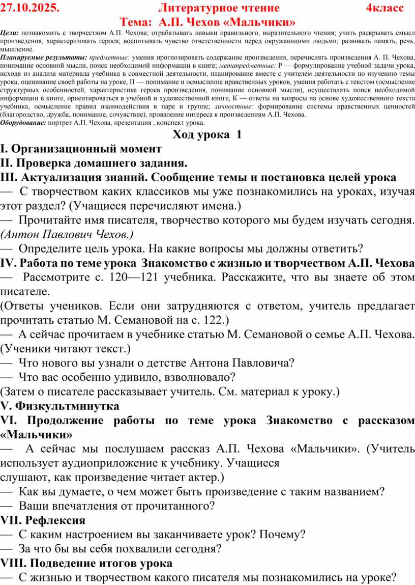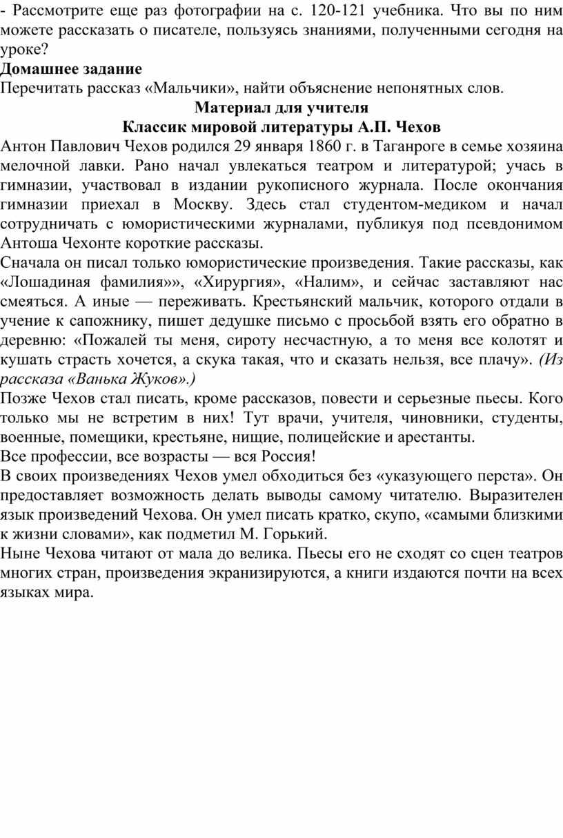Тема: А.П. Чехов «Мальчики»