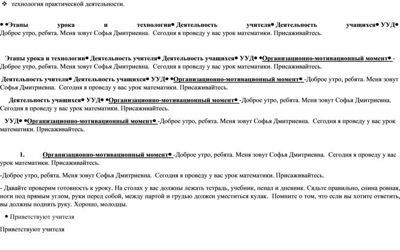 -Доброе утро, ребята. Меня зовут Софья Дмитриевна. Сегодня я проведу у вас урок математики. Присаживайтесь. - Давайте проверим готовность к уроку. На столах у вас должны лежать тетрадь, учебник, пенал и дневник. Сядьте правильно, спина ровная, ноги под прямым углом, руки перед собой, между партой и грудью должен уместиться кулак. Помните о том, что если вы хотите ответить, вы должны поднять руку. Хорошо, молодцы.