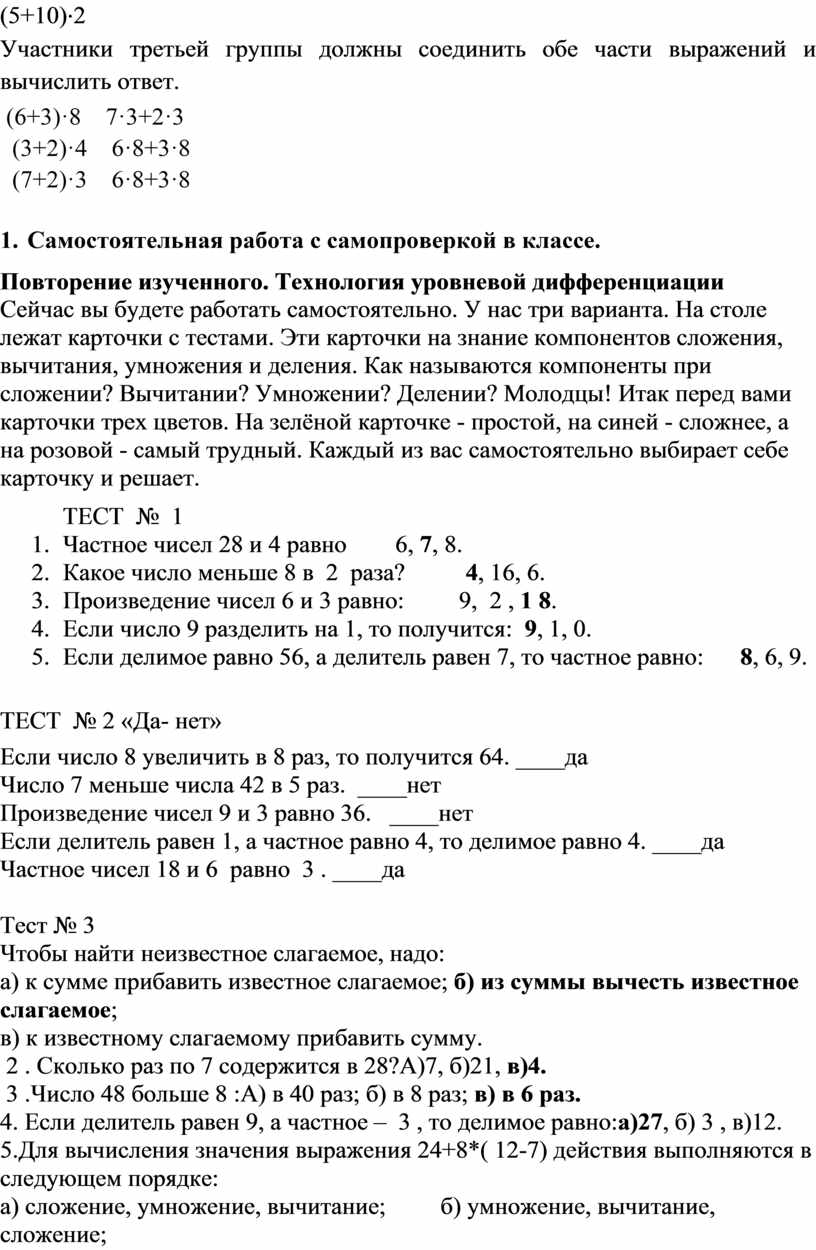 Сейчас вы будете работать самостоятельно. У нас три варианта. На столе лежат карточки с тестами. Эти карточки на знание компонентов сложения, вычитания, умножения и деления. Как называются компоненты при сложении? Вычитании? Умножении? Делении? Молодцы! Итак перед вами карточки трех цветов. На зелёной карточке - простой, на синей - сложнее, а на розовой - самый трудный. Каждый из вас самостоятельно выбирает себе карточку и решает.