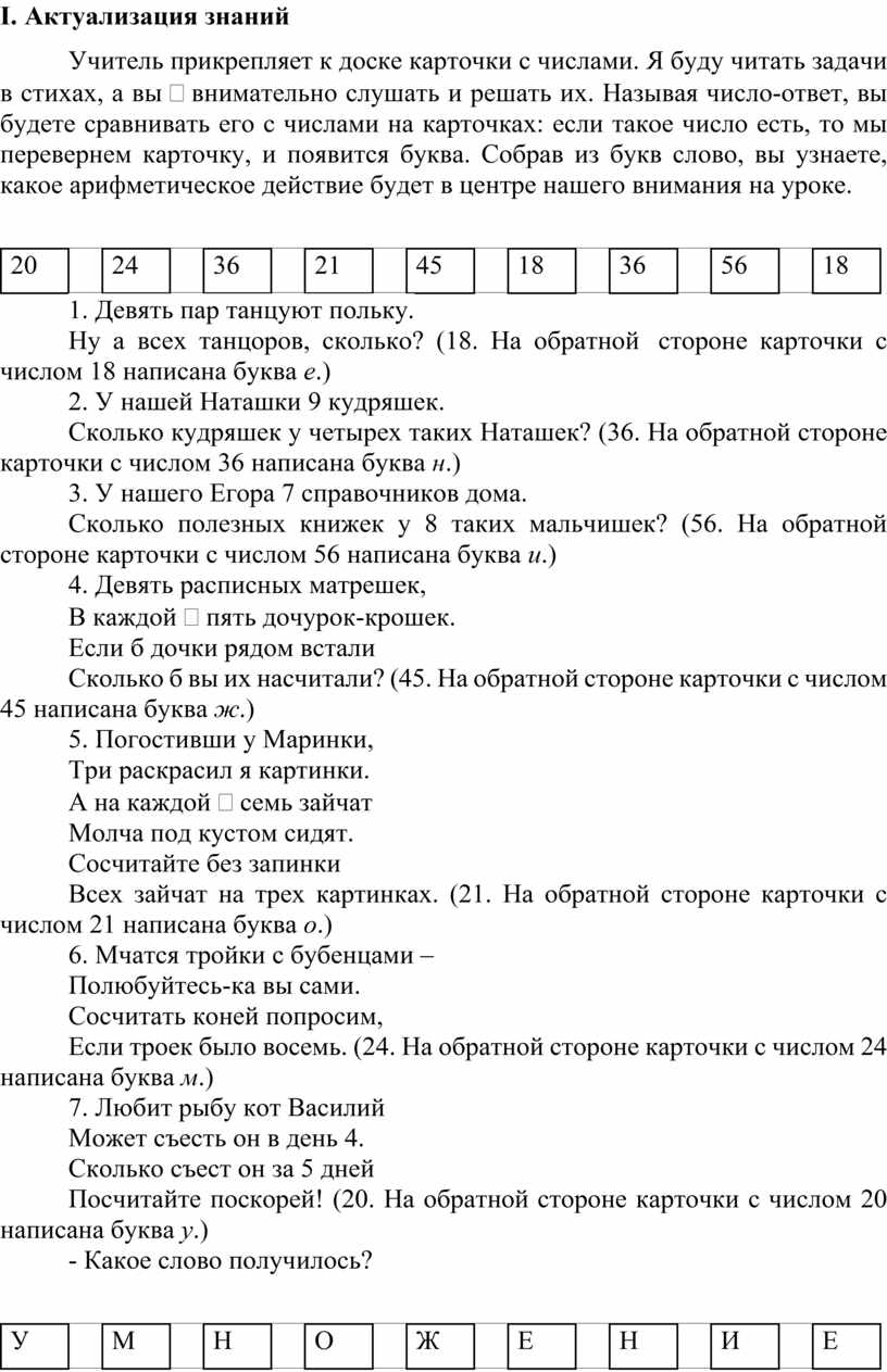 Учитель прикрепляет к доске карточки с числами. Я буду читать задачи в стихах, а вы − внимательно слушать и решать их. Называя число-ответ, вы будете сравнивать его с числами на карточках: если такое число есть, то мы перевернем карточку, и появится буква. Собрав из букв слово, вы узнаете, какое арифметическое действие будет в центре нашего внимания на уроке.
