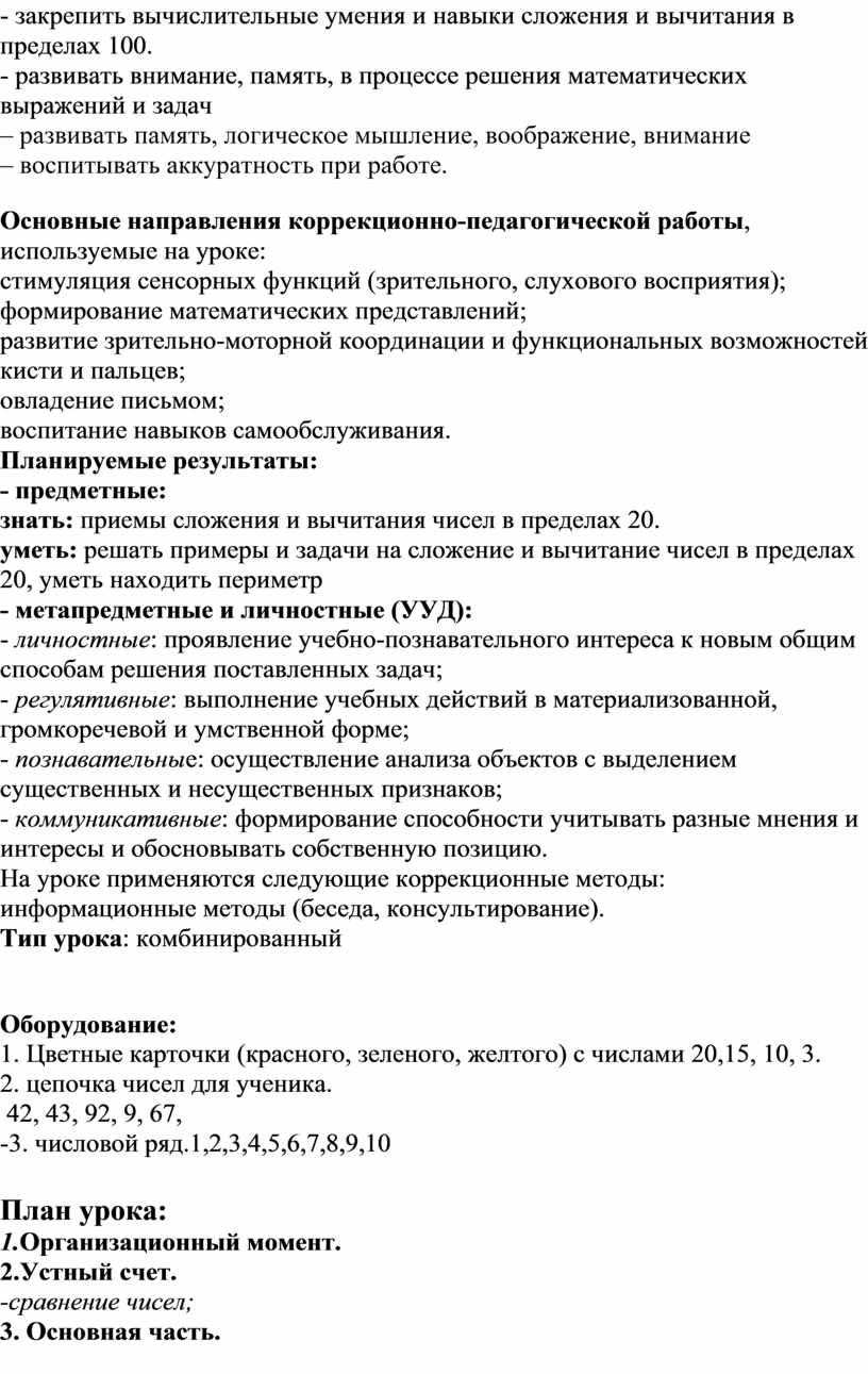 уметь: решать примеры и задачи на сложение и вычитание чисел в пределах 20, уметь находить периметр