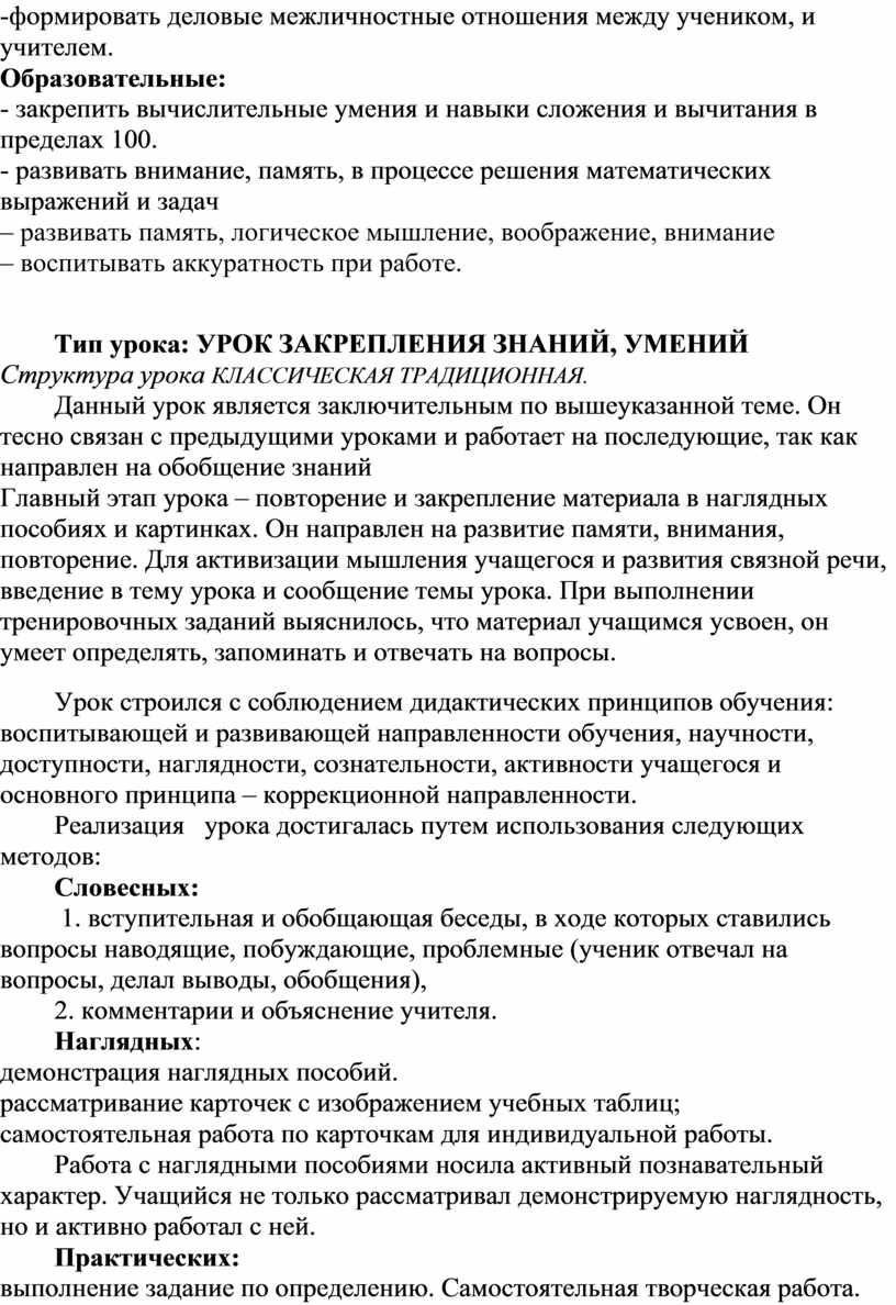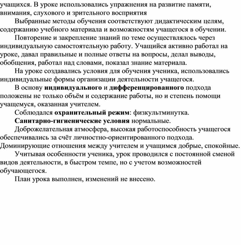 Урок строился с соблюдением дидактических принципов обучения: воспитывающей и развивающей направленности обучения, научности, доступности, наглядности, сознательности, активности учащегося и основного принципа – коррекционной направленности.