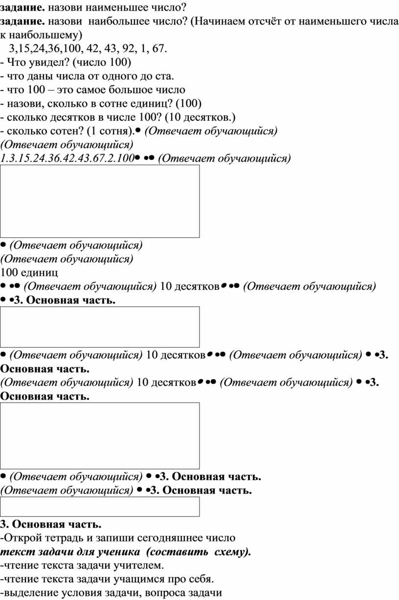 задание. назови наименьшее число? задание. назови наибольшее число? (Начинаем отсчёт от наименьшего числа к наибольшему) 3,15,24,36,100, 42, 43, 92, 1, 67. - Что увидел? (число 100) - что даны числа от одного до ста. - что 100 – это самое большое число - назови, сколько в сотне единиц? (100) - сколько десятков в числе 100? (10 десятков.) - сколько сотен? (1 сотня). |