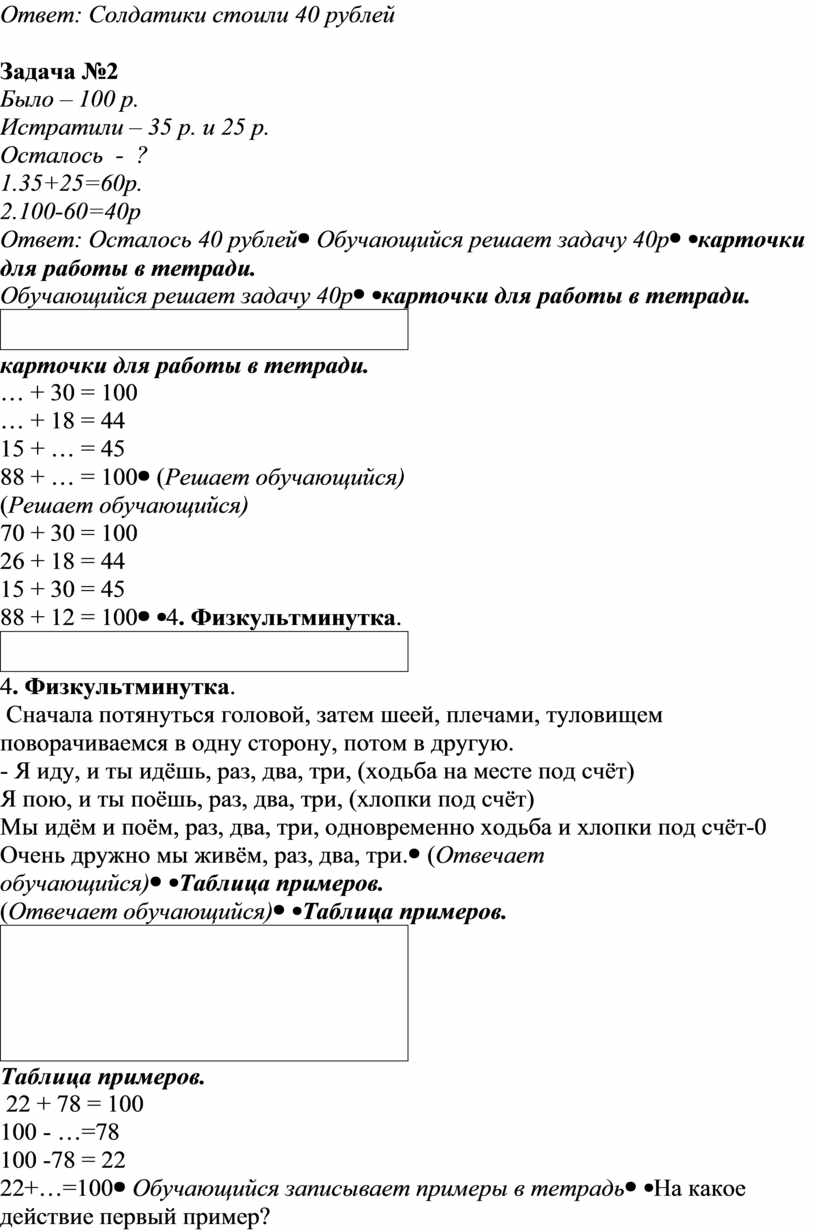 Задача №2 Было – 100 р. Истратили – 35 р. и 25 р. Осталось - ? 1.35+25=60р. 2.100-60=40р Ответ: Осталось 40 рублей |