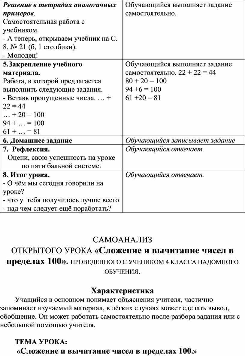 ОТКРЫТОГО УРОКА «Сложение и вычитание чисел в пределах 100». ПРОВЕДЕННОГО С УЧЕНИКОМ 4 КЛАССА НАДОМНОГО ОБУЧЕНИЯ.