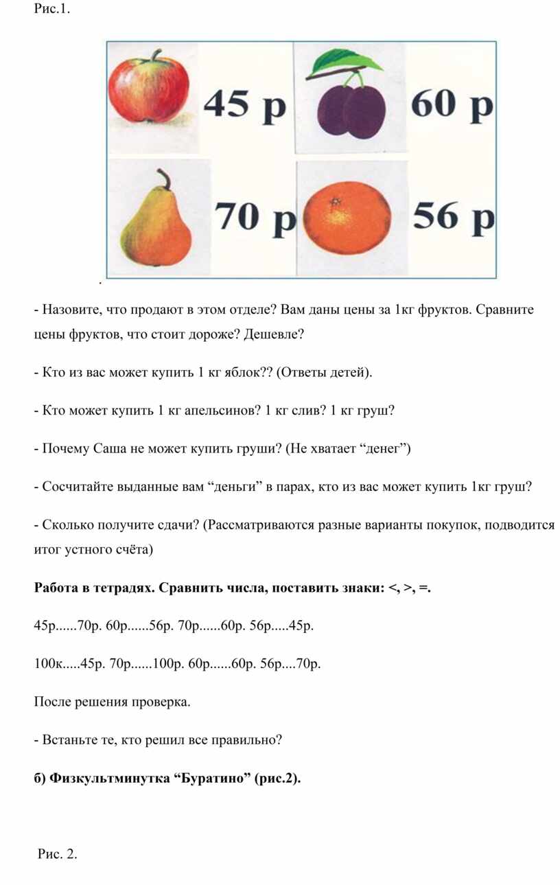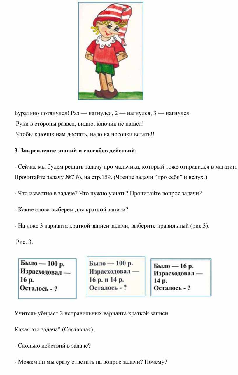 Оборудование: конвертики с “деньгами” для устного счёта; картинки с изображением фруктов; картинка “Буратино” для проведения физкультминутки; 3 варианта краткой записи условия задачи.