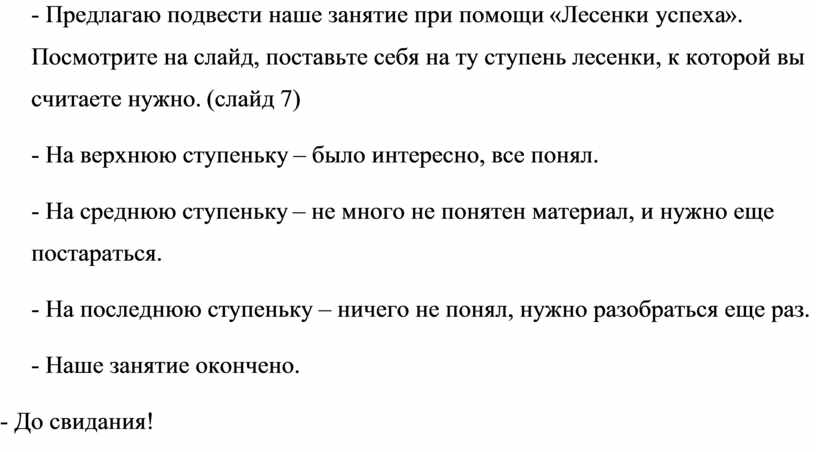 - Предлагаю подвести наше занятие при помощи «Лесенки успеха». Посмотрите на слайд, поставьте себя на ту ступень лесенки, к которой вы считаете нужно. (слайд 7)