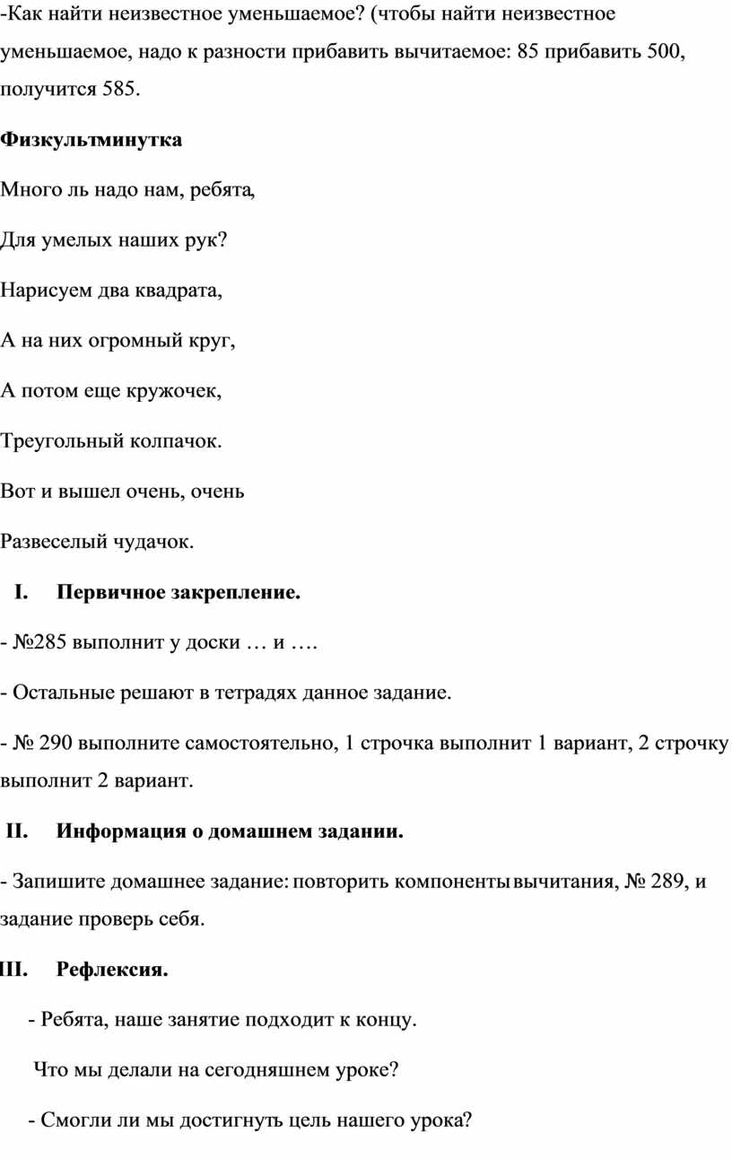 -Как найти неизвестное уменьшаемое? (чтобы найти неизвестное уменьшаемое, надо к разности прибавить вычитаемое: 85 прибавить 500, получится 585.