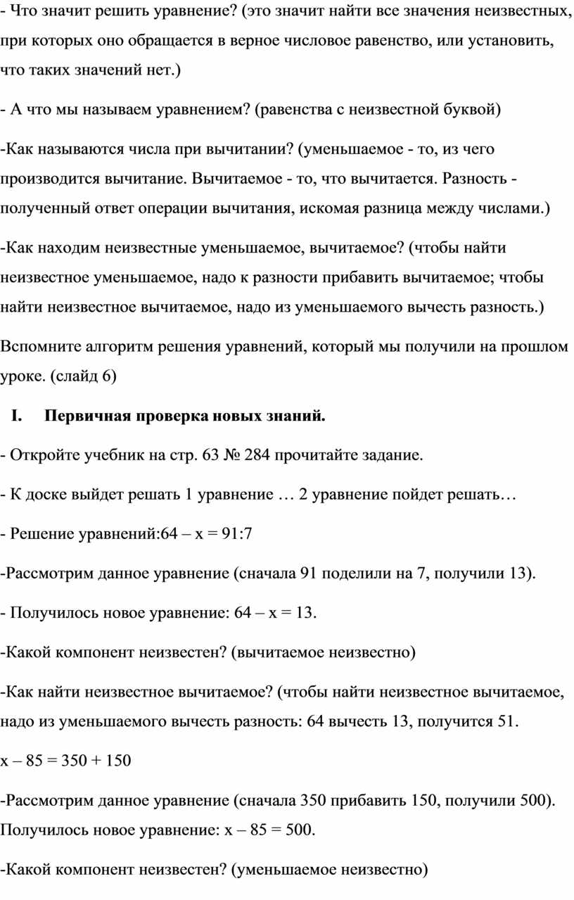 -Рассмотрим данное уравнение (сначала 350 прибавить 150, получили 500). Получилось новое уравнение: х ‒ 85 = 500.