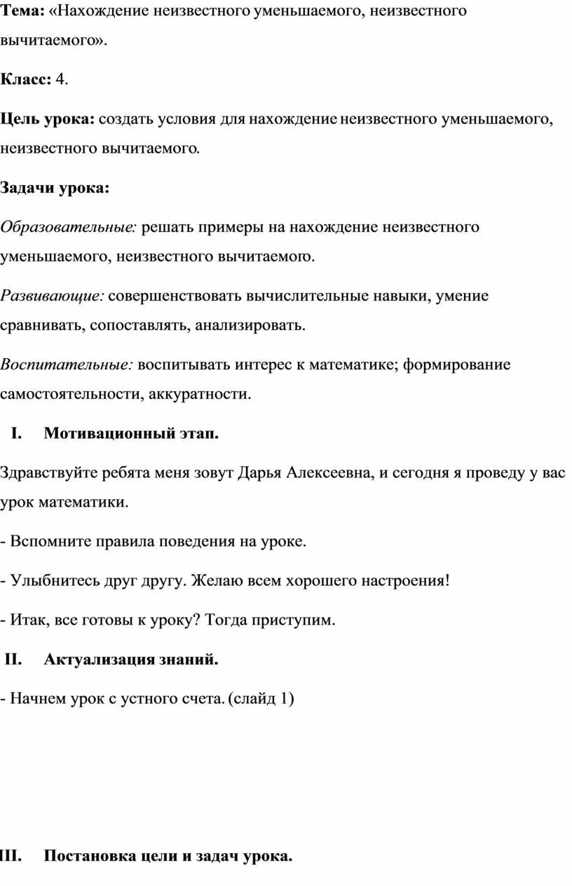Образовательные: решать примеры на нахождение неизвестного уменьшаемого, неизвестного вычитаемого.