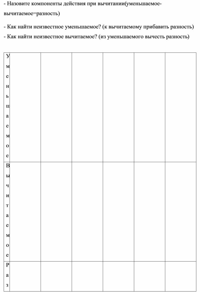 - Назовите компоненты действия при вычитании(уменьшаемое-вычитаемое=разность)