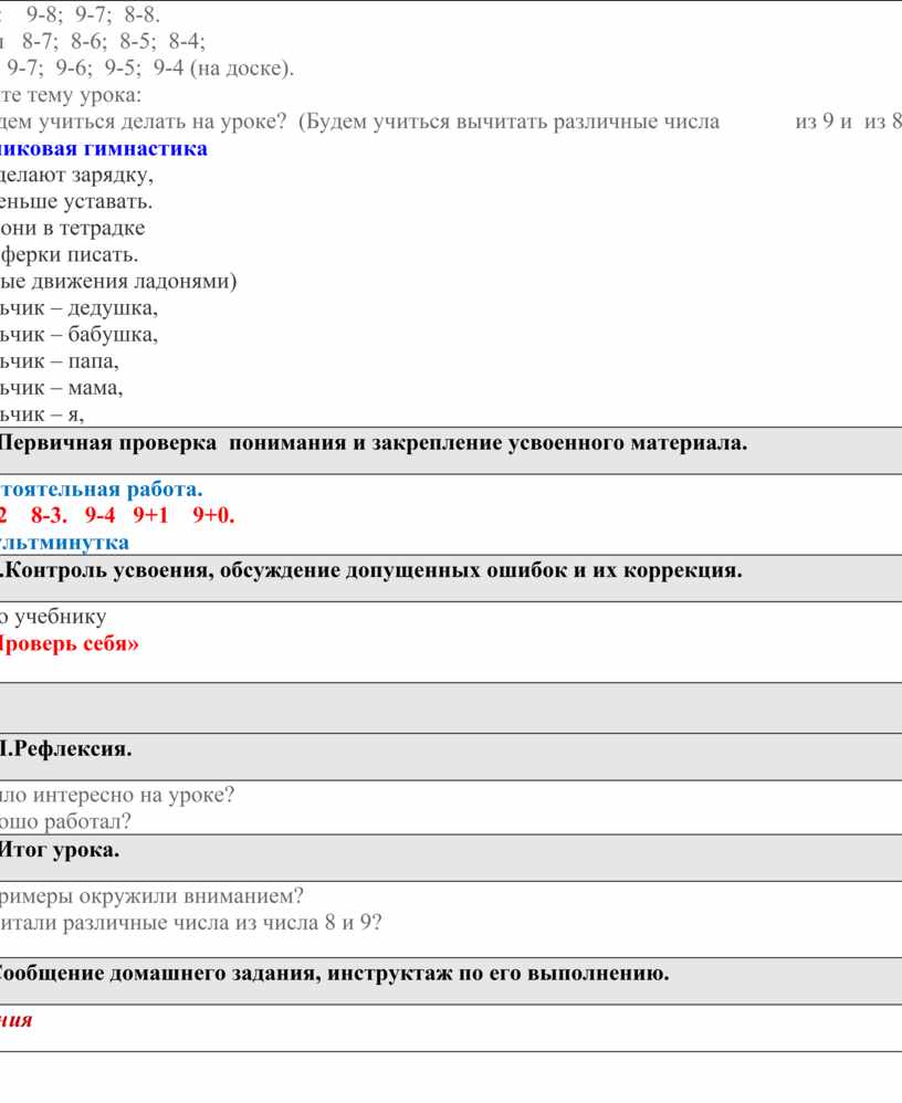 Дети повторят приёмы вычитания из чисел 8 и 9, используя взаимосвязь сложения и вычитания и знание состава чисел 8 и 9, использовать математическую терминологию при чтении примеров.