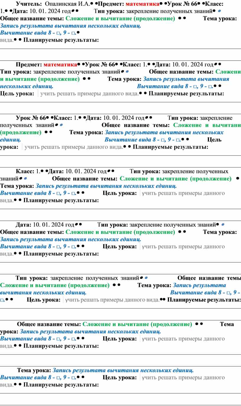 Конспект урока по математике по теме Запись результата вычитания нескольких единиц. Вычитание вида 8 - □, 9 - □.