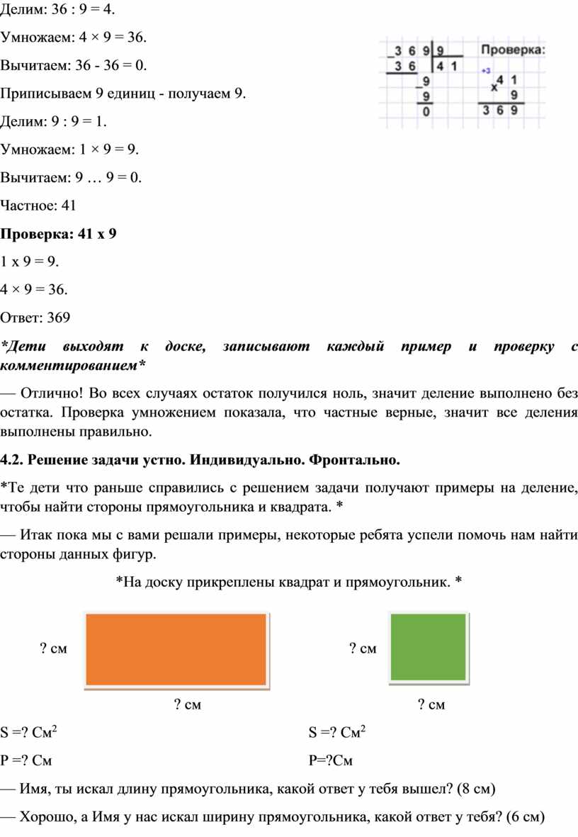 Образовательные задачи: систематизировать и закрепить знания учащихся по алгоритму письменного деления трёхзначного числа на однозначное, а также умения решать текстовые задачи, находить периметр и площадь квадрата и прямоугольника, вычислять значения числовых выражений.