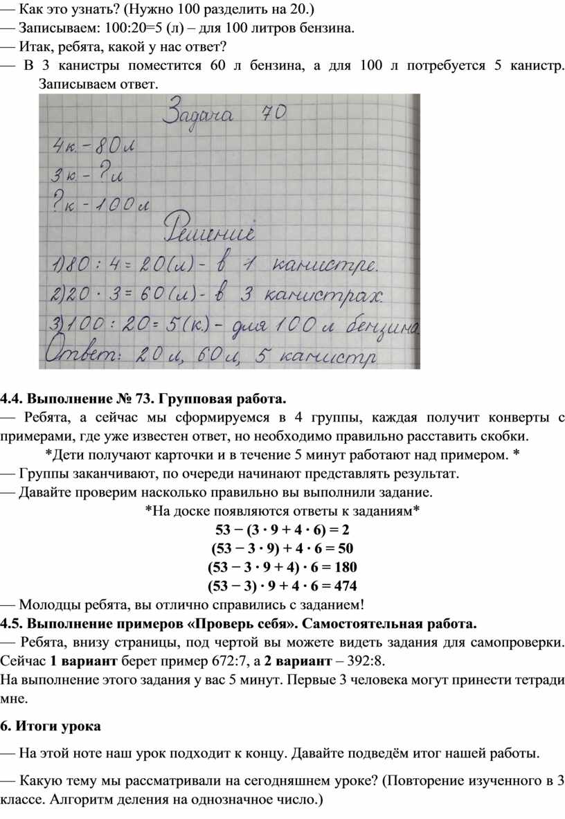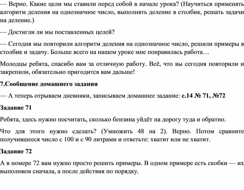 — Сегодня мы повторили алгоритм деления на однозначное число, решили примеры в столбик и задачу. Больше всего на нашем уроке мне понравилась работа…