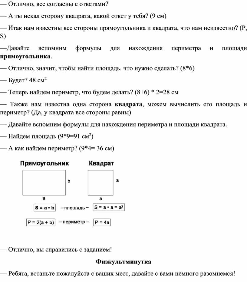 —Давайте вспомним формулы для нахождения периметра и площади прямоугольника.