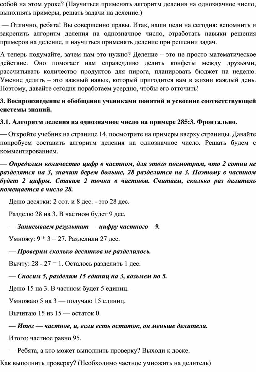 — Отлично, ребята! Вы совершенно правы. Итак, наши цели на сегодня: вспомнить и закрепить алгоритм деления на однозначное число, отработать навыки решения примеров на деление, и научиться применять деление при решении задач.