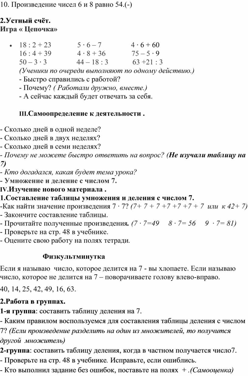 Цели: выявить предварительные знания в применении табличных случаев умножения и деления до 6-ти, составить таблицу умножения и деления с числом 7 и работать над её запоминанием; закреплять умение решать задачи изученных видов; развивать умение работать самостоятельно и в парах.
