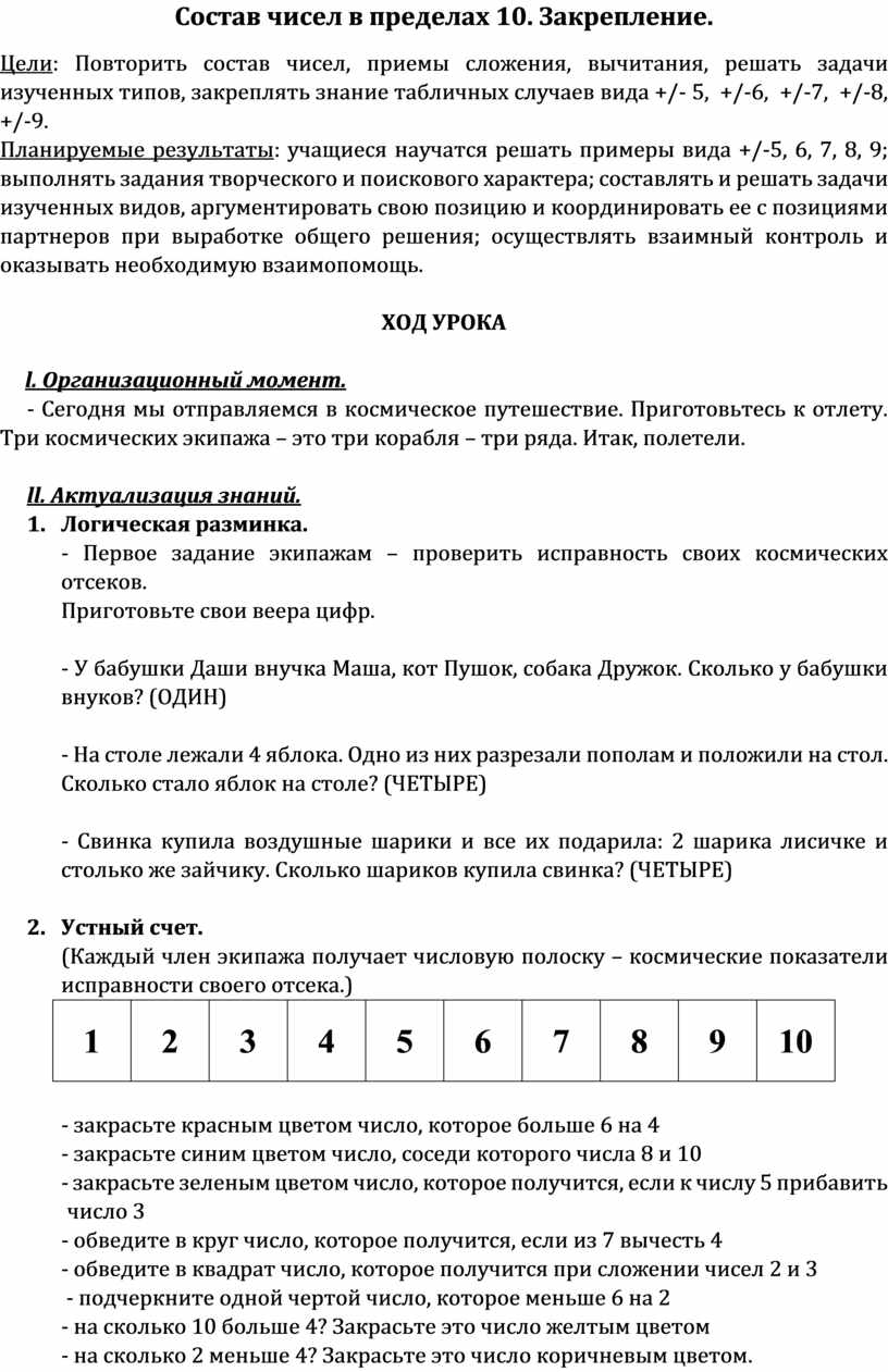 Планируемые результаты: учащиеся научатся решать примеры вида +/-5, 6, 7, 8, 9; выполнять задания творческого и поискового характера; составлять и решать задачи изученных видов, аргументировать свою позицию и координировать ее с позициями партнеров при выработке общего решения; осуществлять взаимный контроль и оказывать необходимую взаимопомощь.