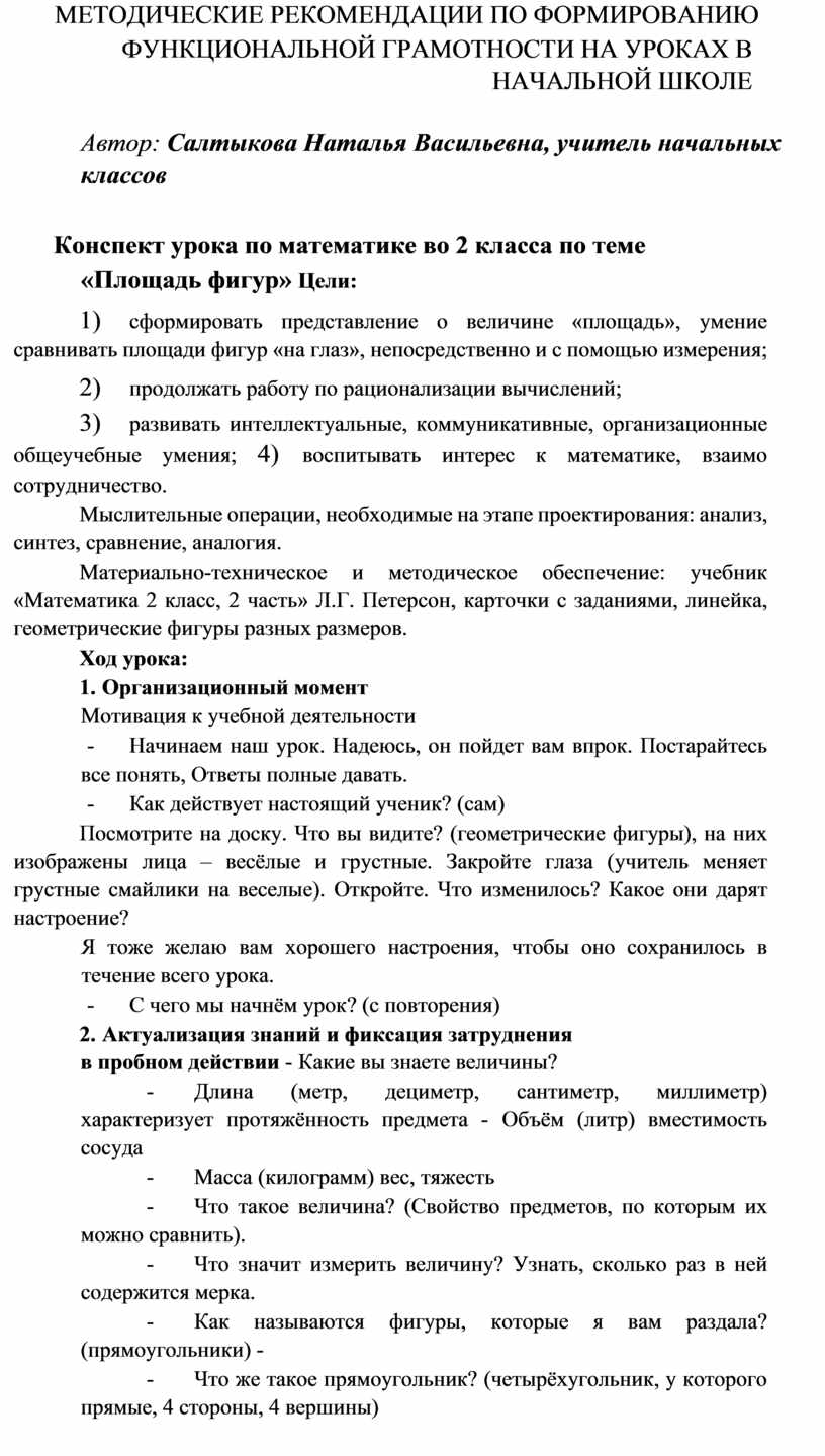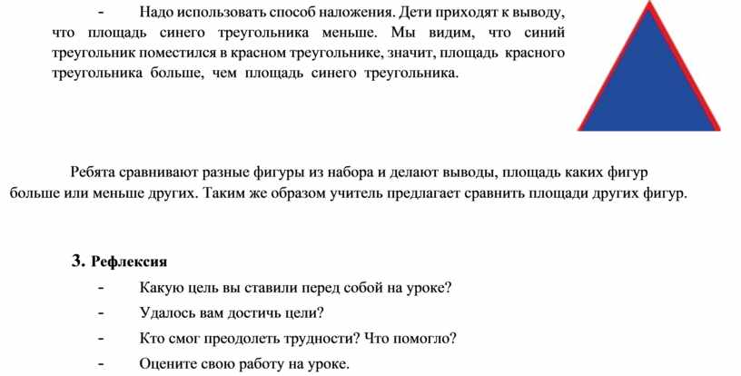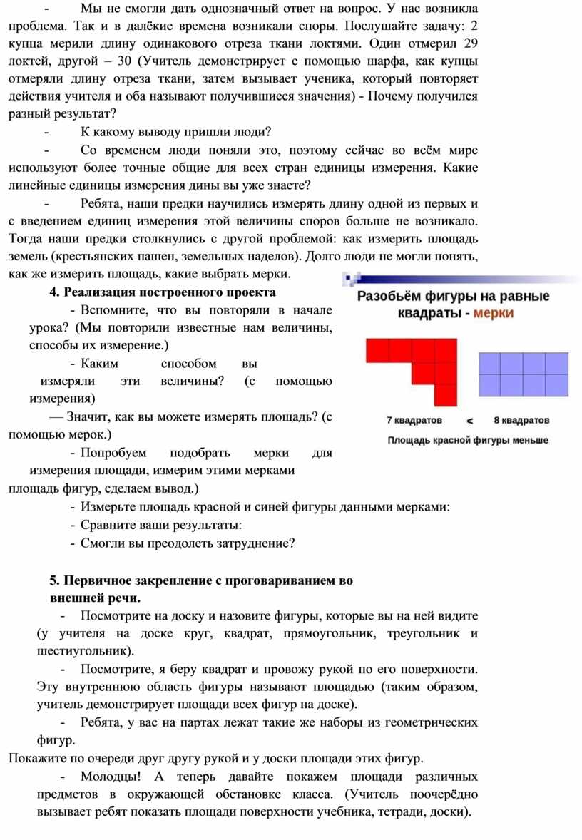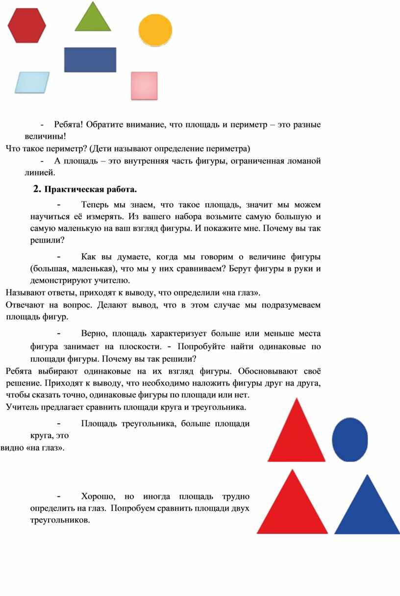 больше или меньше других. Таким же образом учитель предлагает сравнить площади других фигур.
