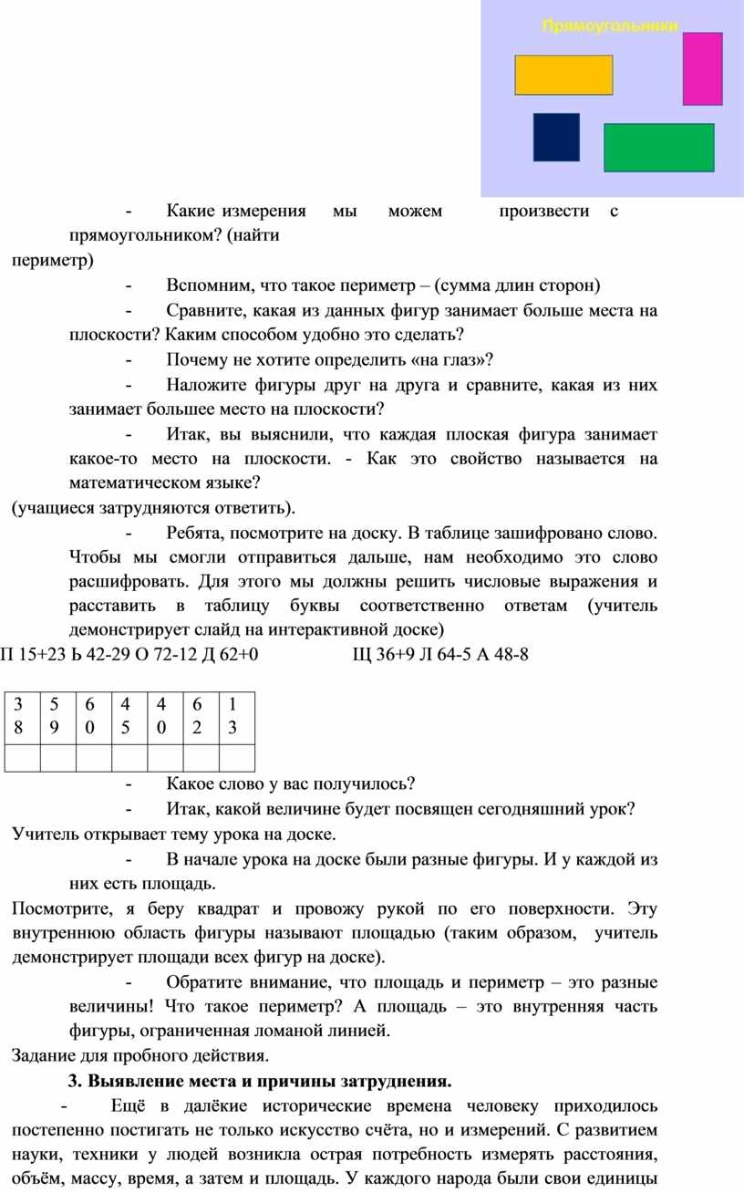 - Посмотрите, я беру квадрат и провожу рукой по его поверхности. Эту внутреннюю область фигуры называют площадью (таким образом, учитель демонстрирует площади всех фигур на доске).
