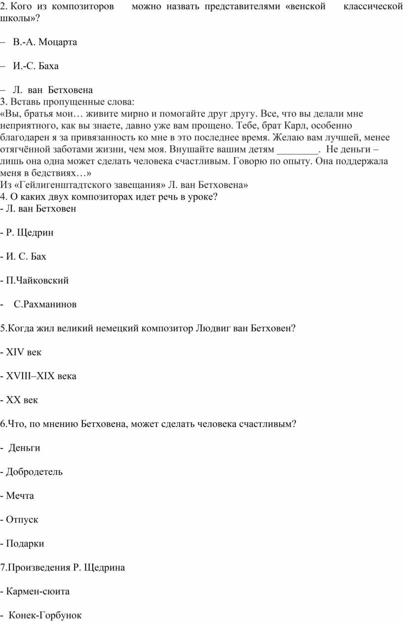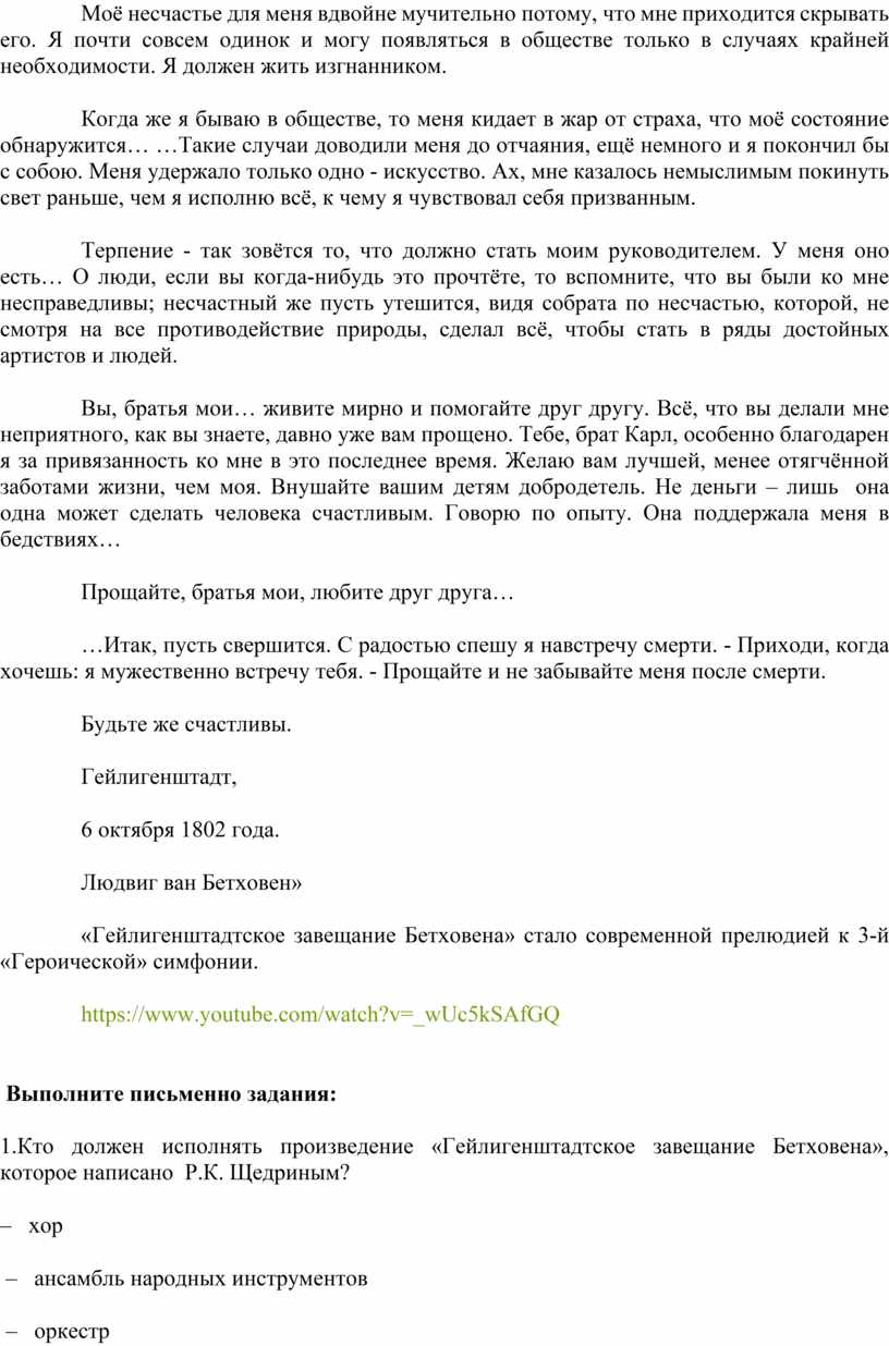 1.Кто должен исполнять произведение «Гейлигенштадтское завещание Бетховена», которое написано Р.К. Щедриным?