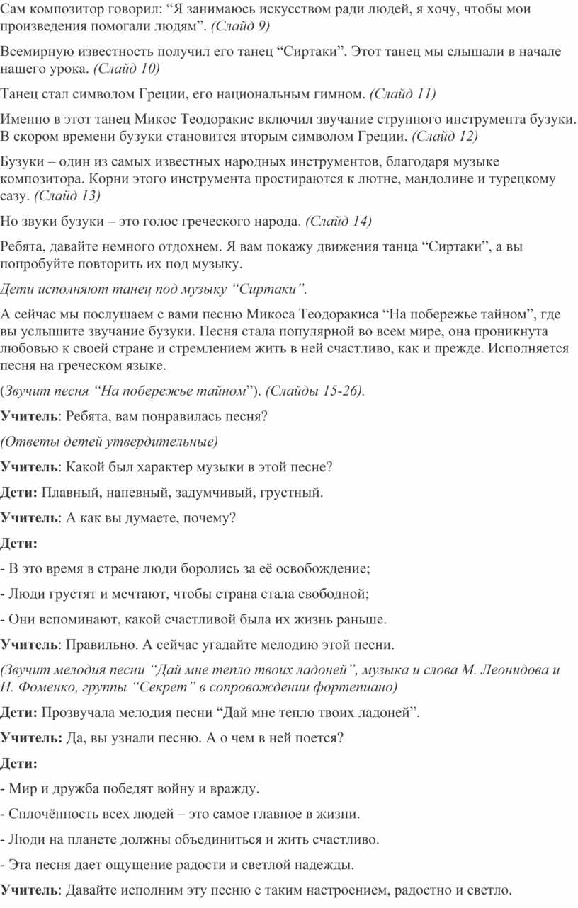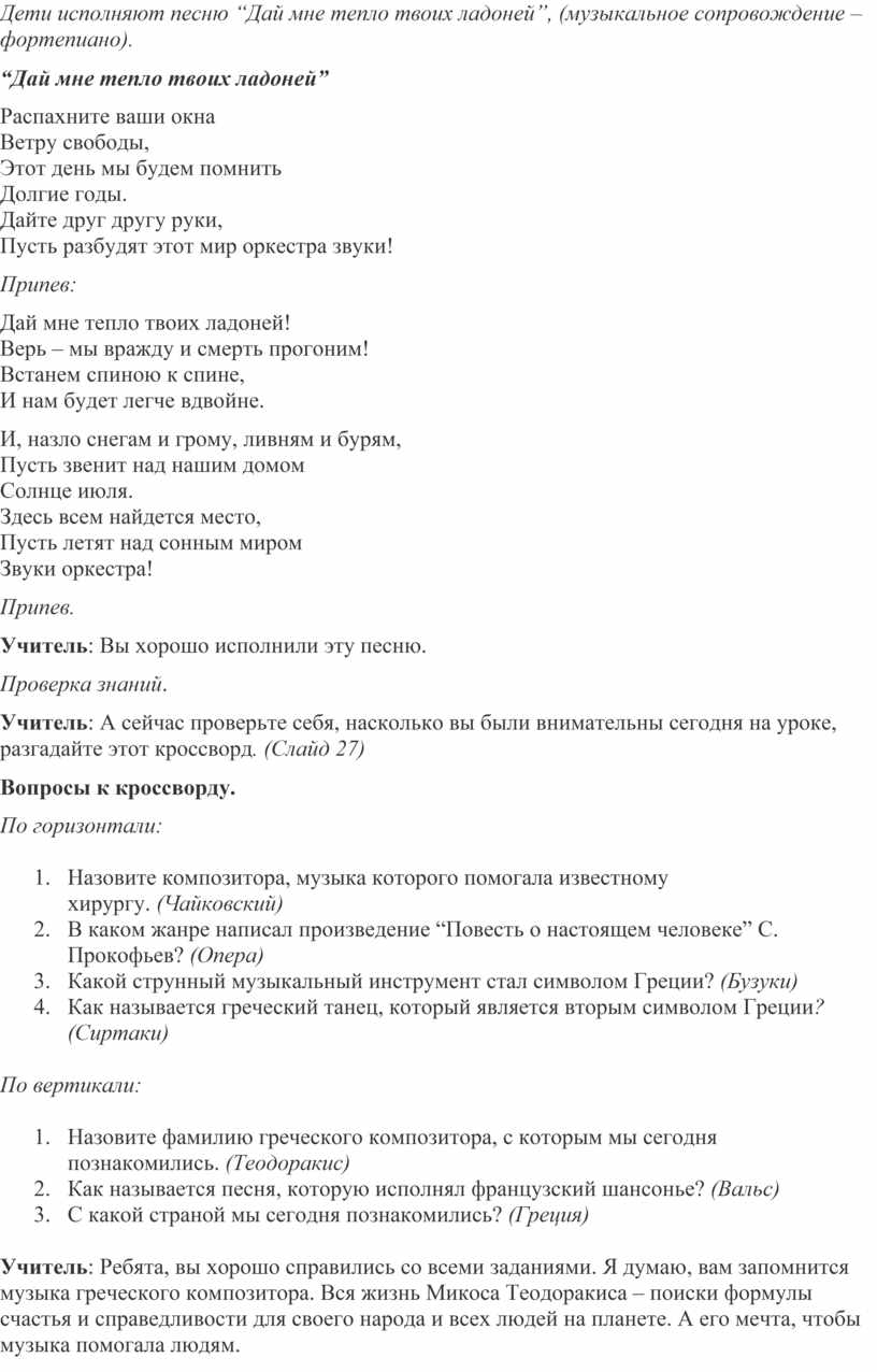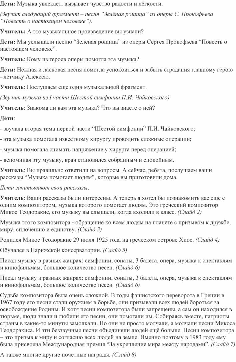 Учитель: Ребята, вы хорошо справились со всеми заданиями. Я думаю, вам запомнится музыка греческого композитора. Вся жизнь Микоса Теодоракиса – поиски формулы счастья и справедливости для своего народа и всех людей на планете. А его мечта, чтобы музыка помогала людям.