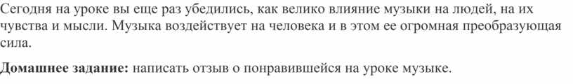 Домашнее задание: написать отзыв о понравившейся на уроке музыке.