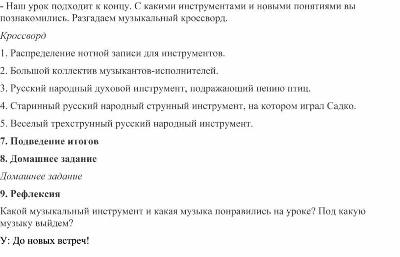 - Наш урок подходит к концу. С какими инструментами и новыми понятиями вы познакомились. Разгадаем музыкальный кроссворд.