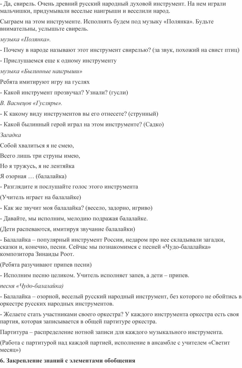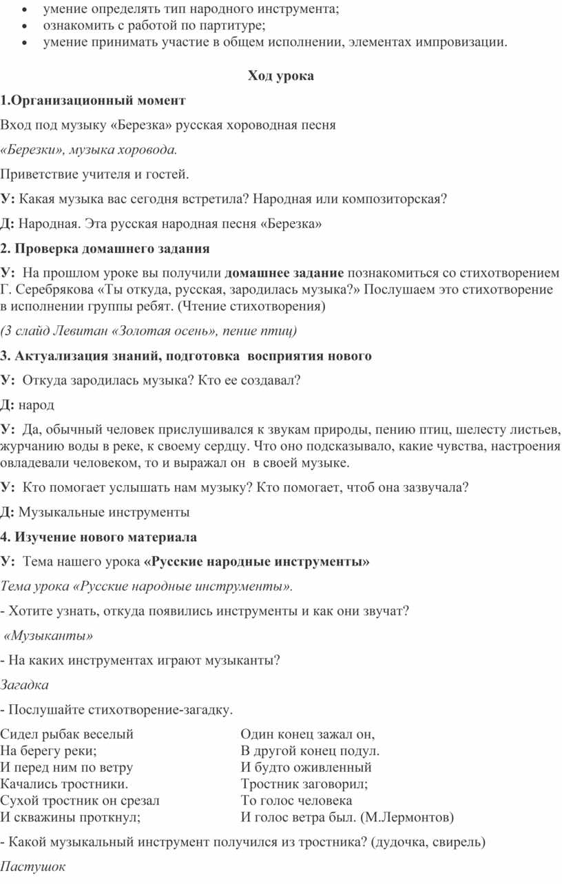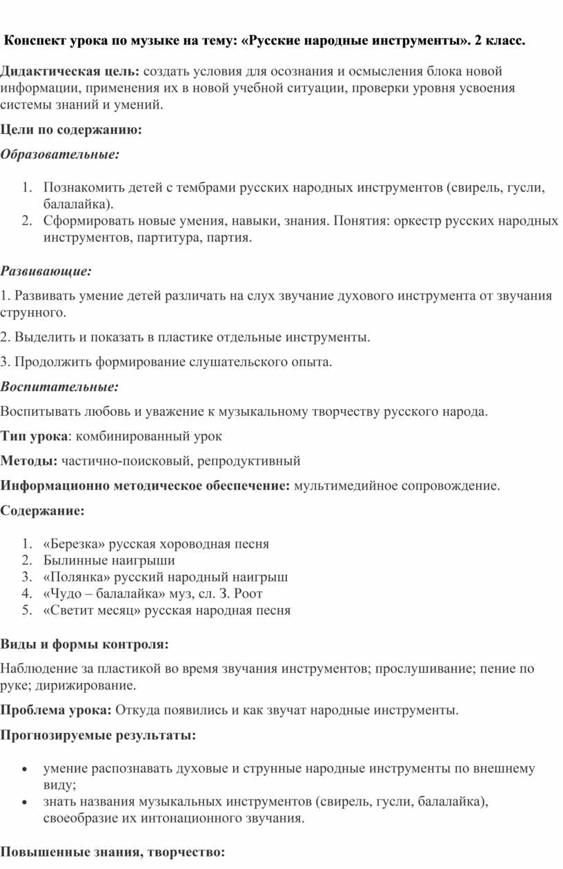 Конспект урока по музыке на тему: «Русские народные инструменты». 2 класс.