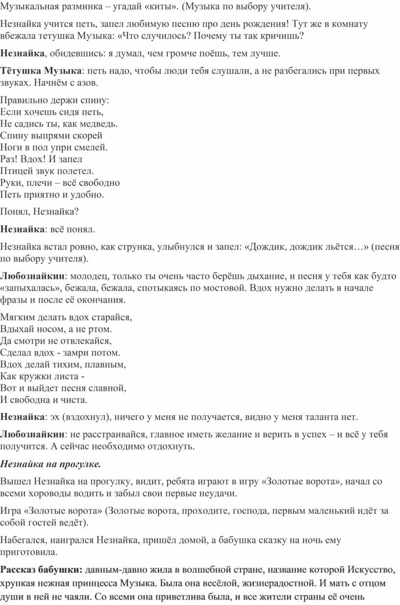 Незнайка встал ровно, как струнка, улыбнулся и запел: «Дождик, дождик льётся…» (песня по выбору учителя).