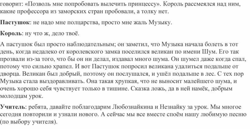 Рассказ бабушки: давным-давно жила в волшебной стране, название которой Искусство, хрупкая нежная принцесса Музыка. Была она весёлой, жизнерадостной. И мать с отцом души в ней не чаяли. Со всеми она приветлива была, и все жители страны её очень любили. Но вдруг она заболела, и с каждым днём болезнь её усиливалась. Не могли помочь никакие доктора и заморские лекари. Тут приходит королевский пастушок говорит: «Позволь мне попробовать вылечить принцессу». Король рассмеялся над ним, какие профессора из заморских стран пробовали, а толку нет.