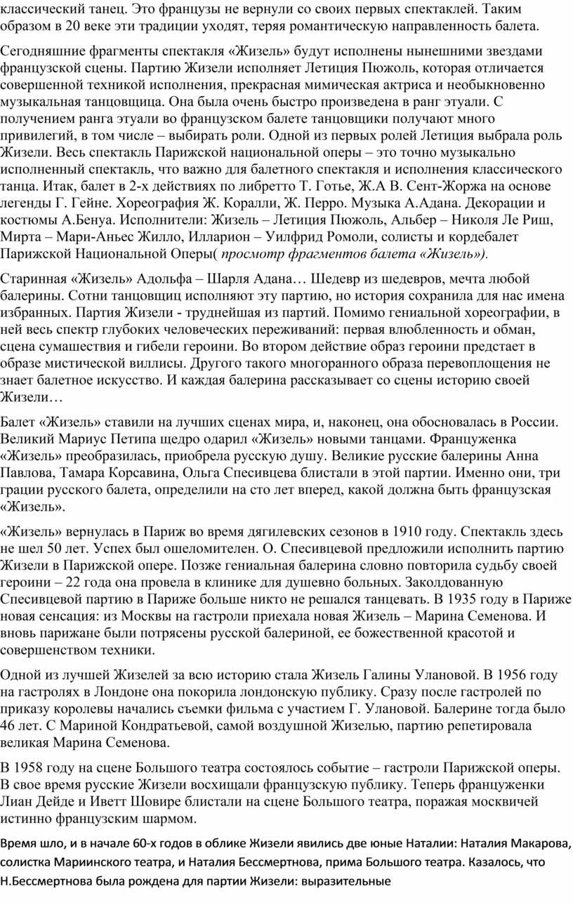 В каждом десятилетии на всех сценах мира рождается своя Жизель. Образ девушки, ставшей символом жертвенной и чистой любви, продолжает волновать зрителей и в XXI веке. Этот исторический спектакль служит украшением любого театра мира, а балерина, в репертуаре которой есть партия Жизели, может считать себя состоявшейся. И каждый день знаменитые балерины прошлых лет продолжают искать новые и новые краски этого вечного образа, но теперь уже со своими ученицами. Сегодня «Жизель», хоть ей уже 170 лет, по-прежнему прекрасна и привлекательна (слайд 26).