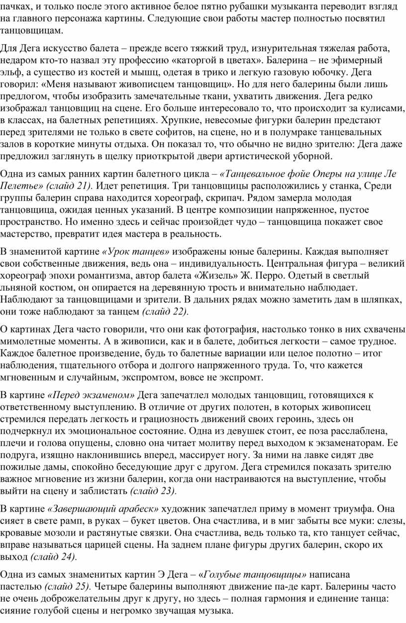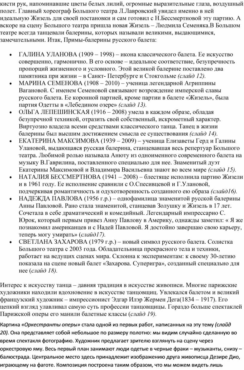 Картина «Оркестранты оперы» стала одной из первых работ, написанных на эту тему (слайд 20). Она представляет собой небольшое по размеру полотно: мы видим случайно сделанную во время спектакля фотографию. Художник предлагает зрителю взглянуть на сцену через оркестровую яму. Весь первый план занимают люди одетые в черные фраки – музыканты, снизу – балюстрада. Центральное место здесь принадлежит изображению друга живописца Дезире Дио, играющему на фаготе. Композиция построена таким образом, что мы можем видеть лишь нижнюю часть идущего на сцене спектакля. Первое, на что обращает внимание зритель – танцовщицы в ярких розовых и голубых пачках, и только после этого активное белое пятно рубашки музыканта переводит взгляд на главного персонажа картины. Следующие свои работы мастер полностью посвятил танцовщицам.