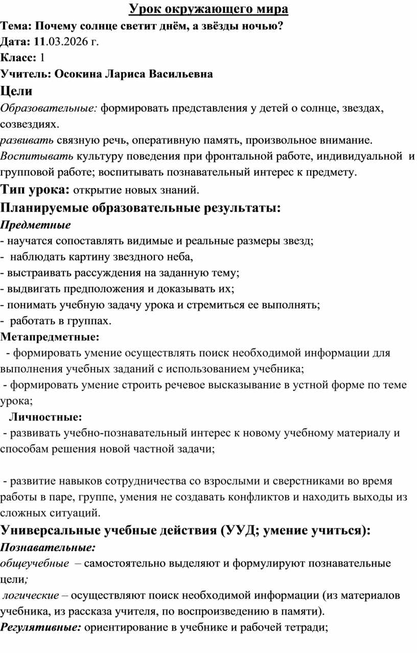 Тема: Почему солнце светит днём, а звёзды ночью?