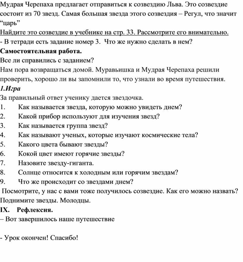 Мудрая Черепаха предлагает отправиться к созвездию Льва. Это созвездие состоит из 70 звезд. Самая большая звезда этого созвездия – Регул, что значит “царь”