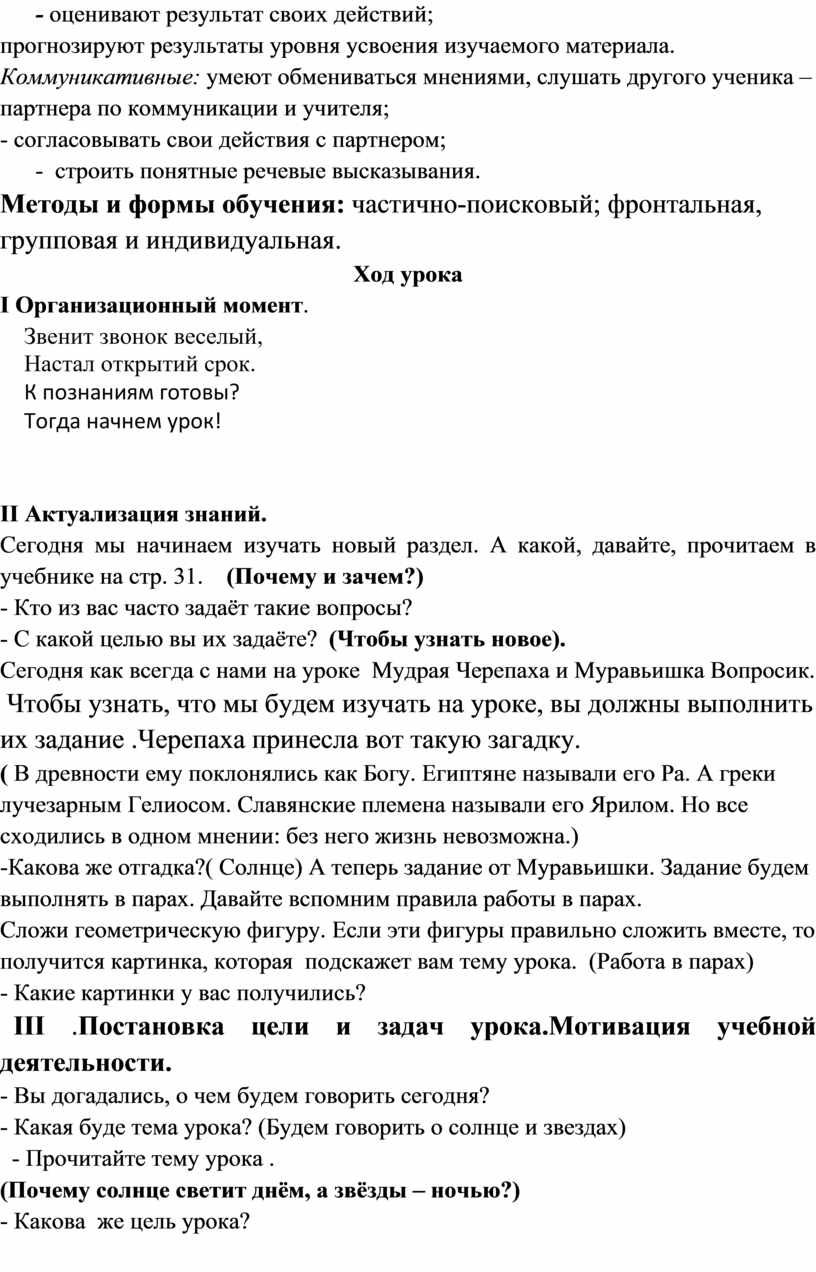 Методы и формы обучения: частично-поисковый; фронтальная, групповая и индивидуальная.