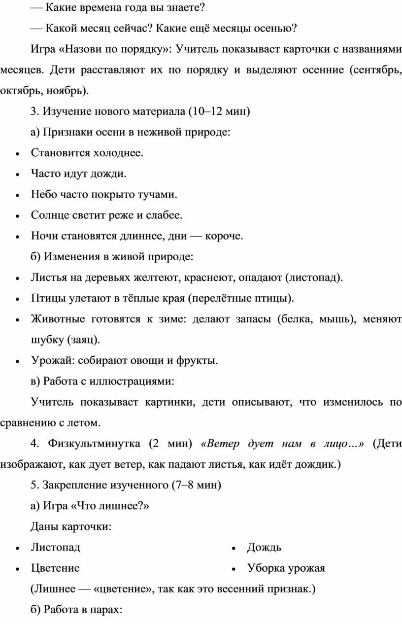 Игра «Назови по порядку»: Учитель показывает карточки с названиями месяцев. Дети расставляют их по порядку и выделяют осенние (сентябрь, октябрь, ноябрь).