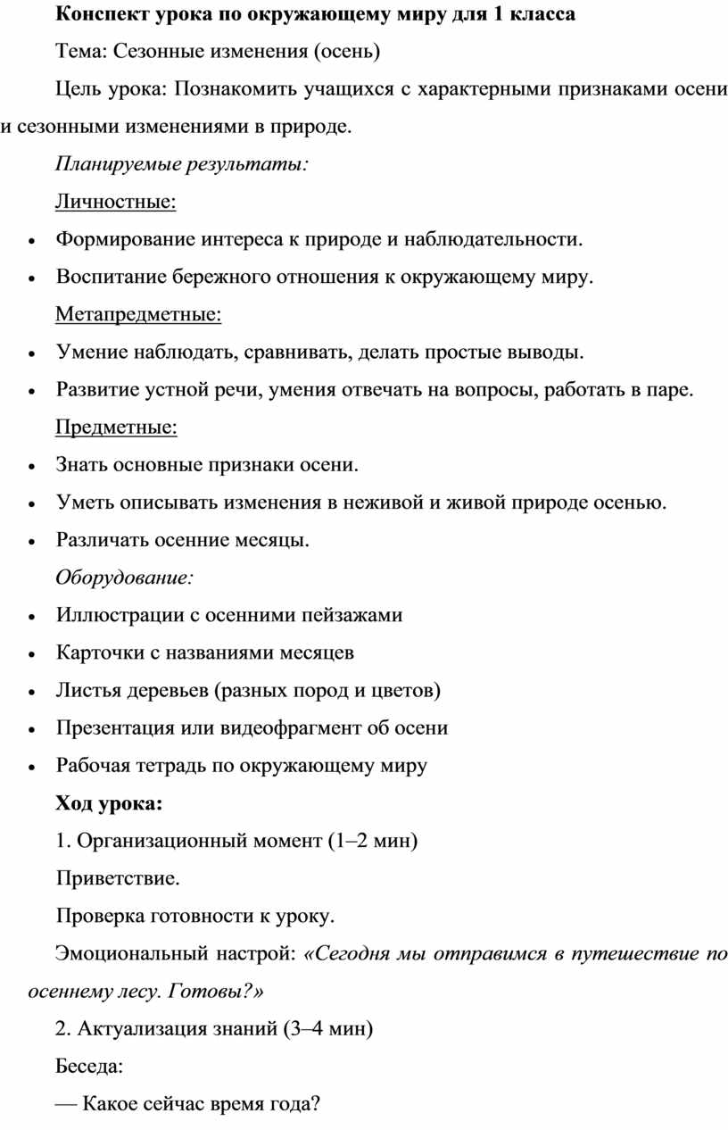 Цель урока: Познакомить учащихся с характерными признаками осени и сезонными изменениями в природе.