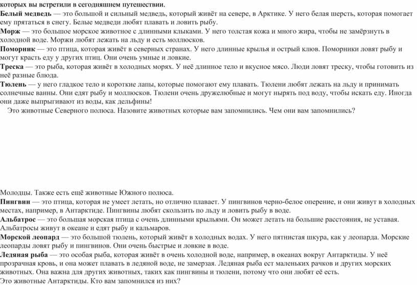 Молодцы, А сейчас я немного расскажу вам про животных которых вы встретили в сегодняшнем путешествии. Белый медведь — это большой и сильный медведь, который живёт на севере, в Арктике. У него белая шерсть, которая помогает ему прятаться в снегу. Белые медведи любят плавать и ловить рыбу. Морж — это большое морское животное с длинными клыками. У него толстая кожа и много жира, чтобы не замёрзнуть в холодной воде. Моржи любят лежать на льду и есть моллюсков. Поморник — это птица, которая живёт в северных странах. У него длинные крылья и острый клюв. Поморники ловят рыбу и могут красть еду у других птиц. Они очень умные и ловкие. Треска — это рыба, которая живёт в холодных морях. У неё длинное тело и вкусное мясо. Люди ловят треску, чтобы готовить из неё разные блюда. Тюлень — у него гладкое тело и короткие лапы, которые помогают ему плавать. Тюлени любят лежать на льду и принимать солнечные ванны. Они едят рыбу и моллюсков. Тюлени очень дружелюбные и могут нырять под воду, чтобы искать еду. Иногда они даже выпрыгивают из воды, как дельфины! Это животные Северного полюса. Назовите животных которые вам запомнились. Чем они вам запомнились?