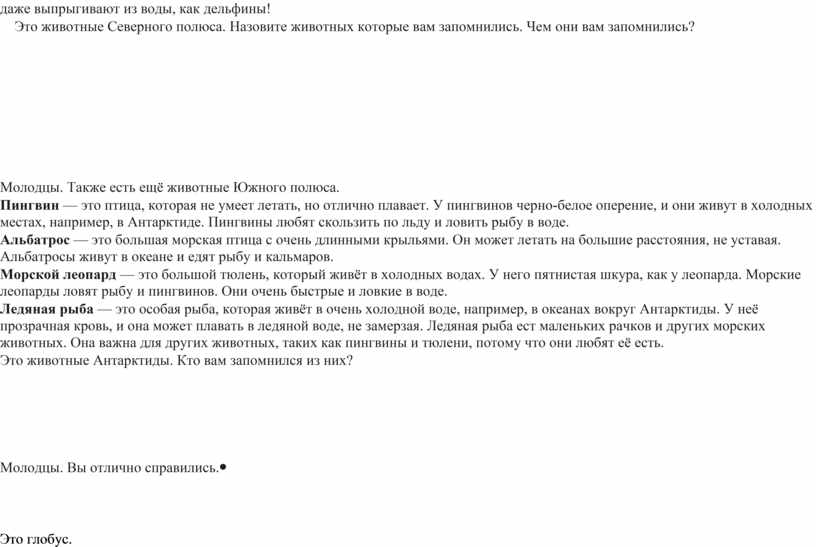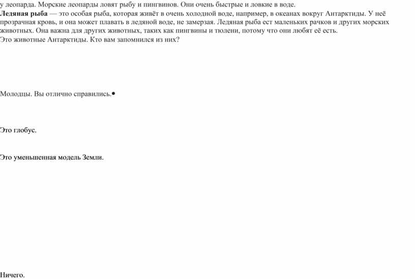 Молодцы. Также есть ещё животные Южного полюса. Пингвин — это птица, которая не умеет летать, но отлично плавает. У пингвинов черно-белое оперение, и они живут в холодных местах, например, в Антарктиде. Пингвины любят скользить по льду и ловить рыбу в воде. Альбатрос — это большая морская птица с очень длинными крыльями. Он может летать на большие расстояния, не уставая. Альбатросы живут в океане и едят рыбу и кальмаров. Морской леопард — это большой тюлень, который живёт в холодных водах. У него пятнистая шкура, как у леопарда. Морские леопарды ловят рыбу и пингвинов. Они очень быстрые и ловкие в воде. Ледяная рыба — это особая рыба, которая живёт в очень холодной воде, например, в океанах вокруг Антарктиды. У неё прозрачная кровь, и она может плавать в ледяной воде, не замерзая. Ледяная рыба ест маленьких рачков и других морских животных. Она важна для других животных, таких как пингвины и тюлени, потому что они любят её есть. Это животные Антарктиды. Кто вам запомнился из них?
