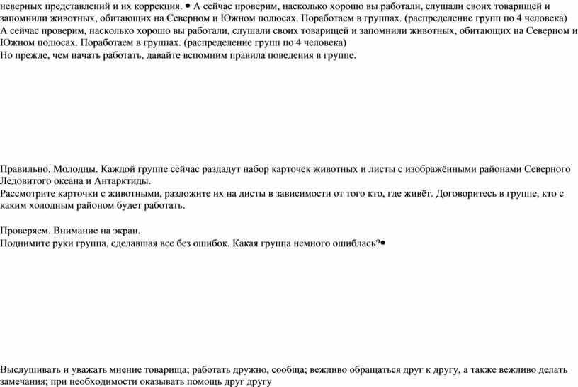 Правильно. Молодцы. Каждой группе сейчас раздадут набор карточек животных и листы с изображёнными районами Северного Ледовитого океана и Антарктиды. Рассмотрите карточки с животными, разложите их на листы в зависимости от того кто, где живёт. Договоритесь в группе, кто с каким холодным районом будет работать.