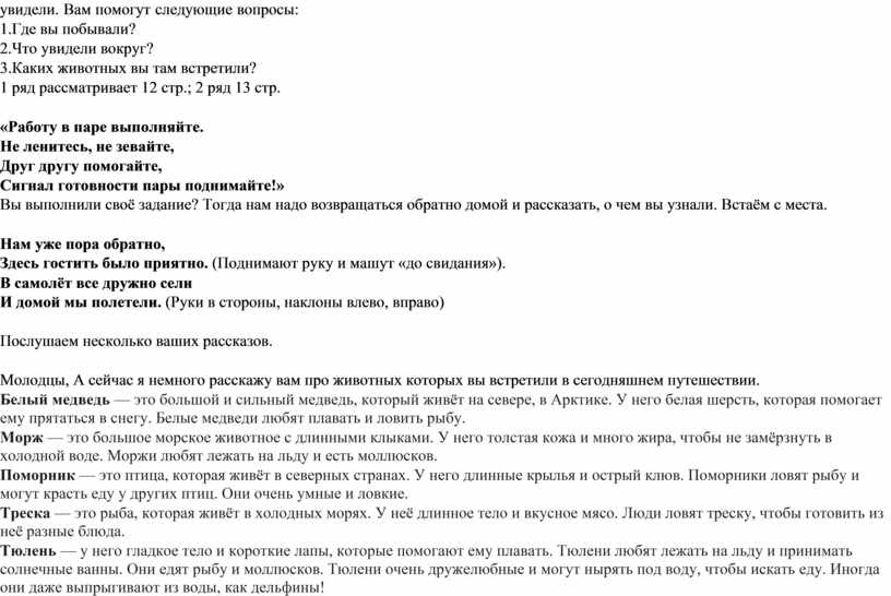 В самолёт все дружно сели (Руки в стороны, наклоны влево, вправо). И на на север полетели. Ниже, ниже, опустились И на на льдину приземлились. (Руки в стороны, наклоны влево, вправо). А кругом зима, мороз Нам пощипывает нос. (Прикрывают поочерёдно нос то правой, то левой рукой). Мы похлопаем в ладошки И согреемся немножко. (Хлопают в ладоши). А теперь попляшут ножки По заснеженной дорожке. (Топают по очереди то левой, то правой ногой). Прилетели на место. Откройте учебники на странице 12 и 13. Вы работаете в парах. Вам нужно внимательно рассмотреть рисунки, и рассказать, что увидели. Вам помогут следующие вопросы: 1.Где вы побывали? 2.Что увидели вокруг? 3.Каких животных вы там встретили? 1 ряд рассматривает 12 стр.; 2 ряд 13 стр.