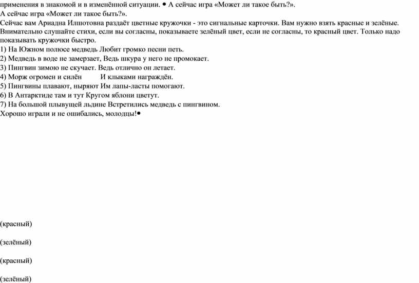 А сейчас игра «Может ли такое быть?». Сейчас вам Ариадна Илшотовна раздаёт цветные кружочки - это сигнальные карточки. Вам нужно взять красные и зелёные. Внимательно слушайте стихи, если вы согласны, показываете зелёный цвет, если не согласны, то красный цвет. Только надо показывать кружочки быстро. 1) На Южном полюсе медведь Любит громко песни петь. 2) Медведь в воде не замерзает, Ведь шкура у него не промокает. 3) Пингвин зимою не скучает. Ведь отлично он летает. 4) Морж огромен и силён И клыками награждён. 5) Пингвины плавают, ныряют Им лапы-ласты помогают. 6) В Антарктиде там и тут Кругом яблони цветут. 7) На большой плывущей льдине Встретились медведь с пингвином. Хорошо играли и не ошибались, молодцы! |