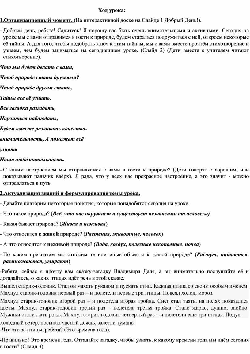 - Добрый день, ребята! Садитесь! Я порошу вас быть очень внимательными и активными. Сегодня на уроке мы с вами отправимся в гости к природе, будем стараться подружиться с ней, откроем некоторые её тайны. А для того, чтобы подобрать ключ к этим тайнам, мы с вами вместе прочтём стихотворение и узнаем, чем будем заниматься на сегодняшнем уроке. (Слайд 2) (Дети вместе с учителем читают стихотворение).