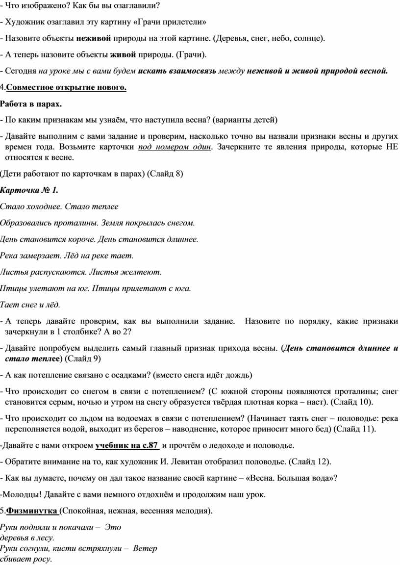 - Давайте выполним с вами задание и проверим, насколько точно вы назвали признаки весны и других времен года. Возьмите карточки под номером один. Зачеркните те явления природы, которые НЕ относятся к весне.