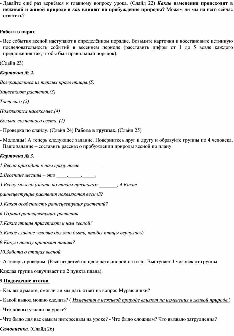 - Давайте ещё раз вернёмся к главному вопросу урока. (Слайд 22) Какие изменения происходят в неживой и живой природе и как влияют на пробуждение природы? Можем ли мы на него сейчас ответить?