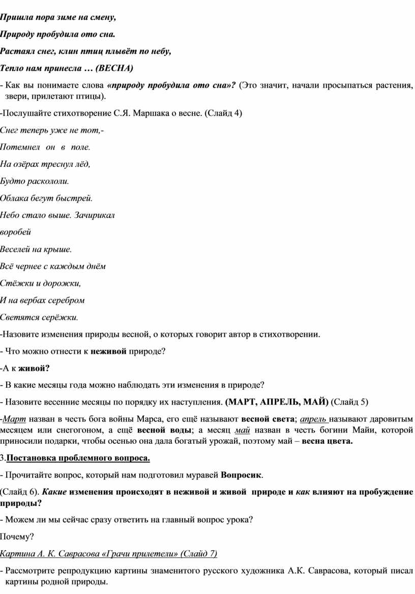 Цель урока: расширение понятийной базы учащихся за счёт включения в неё новых элементов (пробуждение природы, признаки весны, последовательность событий в природе и их связи) и овладение материалом урока на уровне сознательного воспроизведения и запоминания.